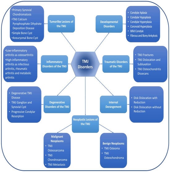 The Diagnostic Criteria for Temporomandibular Disorders (DC/TMD) have been the global standard for evaluating TMDs since 2014 [29]. The DC/TMD have two axes and their corresponding instruments: Axis I for physical diagnosis and Axis II for evaluating psychosocial state and impairment related to pain. The DC/TMD have been validated for several diagnoses using a standardized assessment methodology that includes a thorough investigation of the patient’s medical history and a clinical examination. An advanced diagnostic method that incorporates both patient history and clinical data allows for a high level of sensitivity and specificity in identifying certain subgroups of temporomandibular disorders (TMDs), resulting in high diagnostic accuracy for TMDs in adults [29]. According to Butts et al. [19], TMDs can be classified into three categories: TMDs related to muscle disorders, TMDs related to disc displacement with and without reduction, and TMDs related to joint pain. Recently, TMDs were classified based on their etiology into developmental disorders, traumatic disorders, inflammatory disorders, degenerative disorders, and neoplastic lesions of the TMJ as detailed in Figure 2 [30,31].