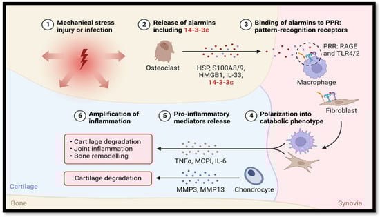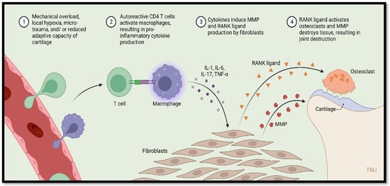 The most prevalent inflammatory condition affecting the joints is OA. Microinjuries and biological factors play a role in its progression (Figure 3). Chronic inflammation in the synovial tissue, subchondral bone remodelling, and cartilage degradation are the hallmarks of OA in the TMJ (Figure 4). Clinical symptoms may include muscle pain and impairment of jaw movements [40,180,181,182,183,184]. Typical erosion, flattening of the condylar bone and articular eminence, osteophytes, articular cysts, and loss of the joint space were recorded in patients with TMJ-OA [182,185]. A study carried out by Kothari et al. [186] revealed that patients with arthritic pain in the TMJ were less sensitive to cold, warm, and tactile sensations than patients with osteoarthritis. It is noteworthy that investigating the biological markers is necessary since a weak correlation exists between the occurrence of bone lesions and the clinical symptoms of TMJ-OA [185,187].