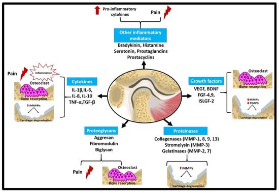 Cytokines, which are diminutive proteins, function as the mediators of inflammation in complex immunological networks [211]. Cytokines include interleukins (ILs), tumour necrosis factor (TNF), interferons, chemokines, and lymphokines. IL-1, IL-6, IL-8, IL-12, and TNF are pro-inflammatory, while IL-4, IL-10, and transforming growth factor-beta (TGF-ꞵ) are anti-inflammatory [211,212]. IL-6 and TGF-ꞵ can have both pro-inflammatory and anti-inflammatory effects [212]. However, there is an ongoing debate over the results concerning cytokines, as TMDs such as OA and internal derangement are associated with high levels of pro-inflammatory cytokines [213]. These mediators release proteinases and other inflammatory molecules that contribute to cartilage and bone degradation.