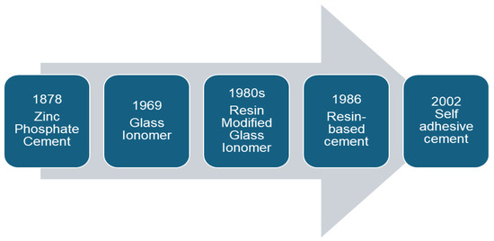 As shown in Figure 1, zinc phosphate cement (ZPC) was first used in 1878 as the “gold standard” for the cementation of restorations with years of clinical success [3,4,5,6,7]. The strengths of zinc phosphate cement include a high compressive strength of up to 104 megapascals and a working time of about 45 s [4]. This cement is used to lute metal and metal–ceramic full-coverage crowns and fixed partial dentures [3,4,5]. However, ZPC demonstrated the disadvantages of high solubility in saliva, a low tensile strength, and the potential for hypersensitivity due to a low pH at the time of cementation [4].
