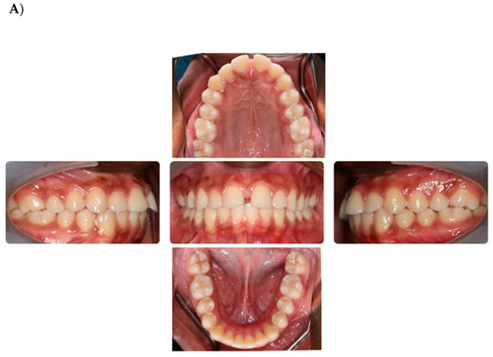 (A) Pre-treatment intraoral photographs (T1); (B) 18 weeks into treatment with BRIUS (T2).