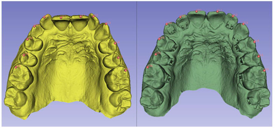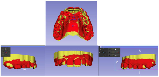 Three-dimensional superimposition of T1 and T2 models was performed to evaluate individual tooth movements achieved in three planes of space (x-axis [antero-posterior], y-axis [bucco-lingual], and z-axis [superior–inferior]) and combined 3D movements for each maxillary and mandibular tooth from first molar to first molar. Dental model superimpositions were performed using 3D Slicer software (version 5.6.1 for Windows, www.slicer.org). Maxillary and mandibular superimpositions, model approximations, and identification of landmarks and regions of interest were performed in reference to previous studies [7,8,9]. After uploading them into 3D Slicer software, the models were oriented within digitally constructed sagittal, axial, and coronal planes. The two models were then “approximated” using the mesiobuccal cusp tips of the first molars and the buccal cusp tips of the second premolars (Figure 2).