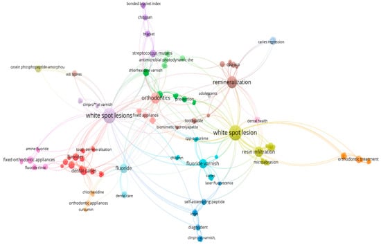 There were 365 keywords identified across all articles. All irrelevant keywords, including age and gender, were eliminated. The investigation revealed that the most frequently used terms were “white spot lesions”, “orthodontics”, “remineralization” and “fluoride varnish.” A distinct colour is used to represent each cluster (Figure 1).