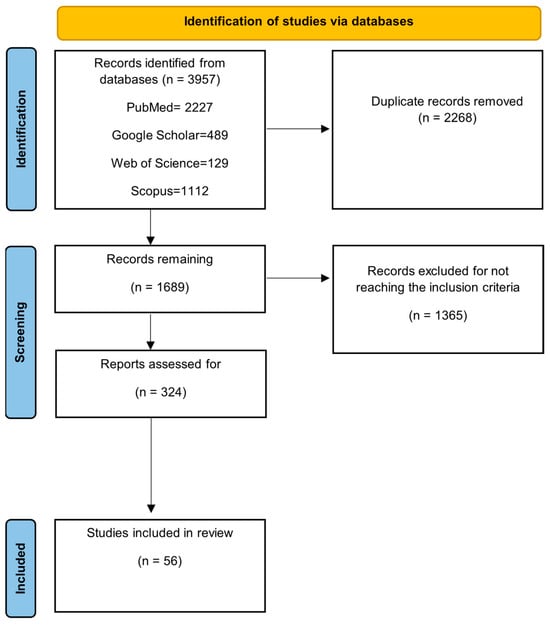 There was a total of 3957 results. The filters applied to the search were (1) publication date no older than 2010, (2) only articles in English and (3) both trials and reviews were screened. Only publications after 2010 were pursued in the election process for present relevance and accuracy. After the filters were applied and duplicates were removed, only 324 results remained. Out of those remaining publications, after a full article review, 56 were selected for the present review (Figure 2).
