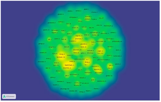 A total of 433 authors were identified and included in the coauthorship analysis. Not all authors were connected; only 17 connections between the authors were found. The difference between the size and colour of the clusters represents the density of documents (Figure 5).