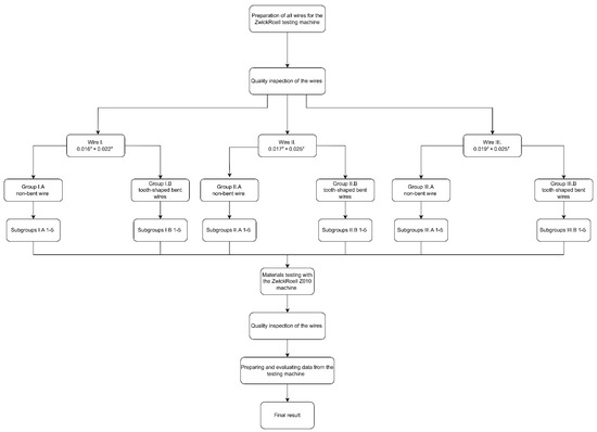 Two independent main groups (A and B) were tested for all wire types, where all cross-sections were examined once with a non-tooth-shaped bent wire (A) group and with a tooth-shaped bent wire (B) group. The main groups were further divided into five subgroups according to the wire types (see Figure 1; I.A/B 1-5, IIA/B 1-5, III.A/B 1-5), representing the elastic range in 1 mm increments up to 5 mm. A maximum distance of 5 mm was used because, in preliminary testing, some samples exhibited plastic deformation beyond 5 mm and were no longer in the elastic phase. The first experiment was conducted with wire type I. from the main group A. The five subgroups (groups I.A1 to I.A5) were extracted based on the Excel tables generated by the testing machine. This procedure was also applied to wire type II. and wire type III. for the main groups II.A and III.A. Subsequently, the main group B (tooth-shaped bent wires) was tested following the same scheme. A total of 15 identical samples were tested per subgroup to ensure statistical reliability and account for any potential variability in the wire material or bending process. The sample size of 15 was chosen because this number has proven to be effective in preliminary studies to ensure reliable and meaningful results. The results of the preliminary studies carried out supported the decision in favor of 15 samples, as they showed sufficient statistical power and consistency to confirm the reliability of the results. This resulted in 75 samples for each main group and 150 samples for each wire cross-section. The testing machine (ZwickRoell GmbH and Co. KG, Ulm, Germany) was operated in a displacement-controlled mode to ensure the consistent deformation of the wires. All relevant parameters, such as force and displacement, were reset to zero before each test to ensure accurate and reproducible measurements.