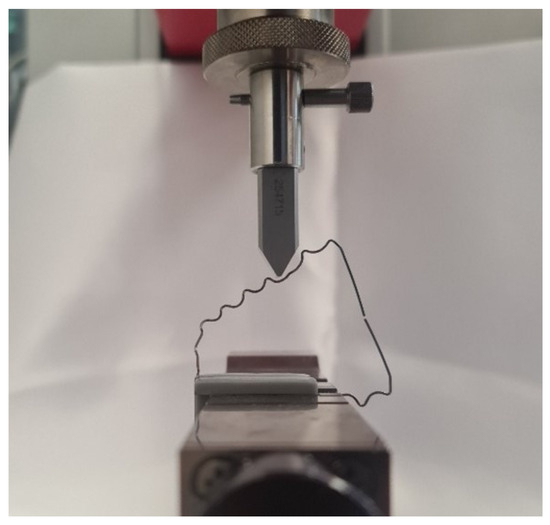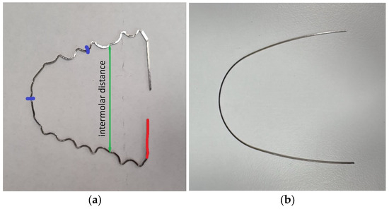 At the outset of the experiment, the steel wire was positioned on a flat surface to confirm its level and parallelism. Subsequently, the intermolar distance was gauged with a ruler to ascertain a uniform and accurate distance of 4 cm [16]. A red mark was made on the test side of the wire, as shown in Figure 1, to test the same half of the tooth-shaped bent wire in all samples. The two blue marks served for the precise positioning of the clamping jaws on the wire. In Figure 1, a blue linear marker is also visible, which was used to align the clamping jaws in the clamping jaw chuck of the material testing machine.