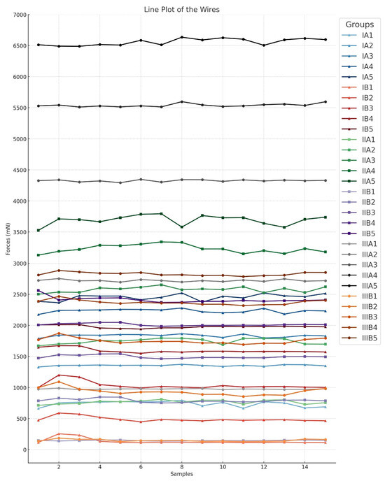 The comparison of the different wire types (Wires I., II., and III.) within the A groups and the B groups using the Kruskal–Wallis test also showed significant differences between the groups (H = 39.130; df = 2; p < 0.001). To isolate the group or groups that differ from the others, a multiple comparison procedure was performed. All pairwise multiple comparison procedures were conducted using the Tukey test (p < 0.050). A line plot was constructed for the purpose of visualizing the data (Figure 4) (Table 4).