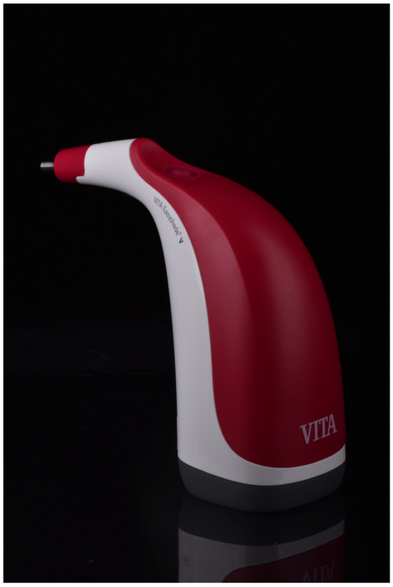 Visual and a digital color determination were conducted by each participant for each specimen. For visual color matching, a reference scale (3D-Master Toothguide (3DM_TG), Vita Zahnfabrik, Bad Säckingen, Germany) [47] was used, while the digital color determination was conducted with the help of a spectrophotometer (Vita Easyshade V (ES_V), Vita Zahnfabrik) [1] (Figure 1 and Figure 2). Visual color determination was conducted in dental treatment rooms under constant natural light at lunchtime, supported by room lighting. Digital color determination was also carried out at the same time and the same conditions as described above. An average measurement was carried out. For this purpose, the same area of the 3D-printed tooth was measured three times, and the average value and the corresponding tooth shade were recorded.