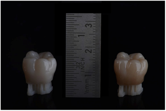 - Atria, P.J.; Bordin, D.; Marti, F.; Nayak, V.V.; Conejo, J.; Benalcazar Jalkh, E.; Witek, L.; Sampaio, C.S. 3D-printed resins for provisional dental restorations: Comparison of mechanical and biological properties. J. Esthet. Restor. Dent. 2022, 34, 804–815. [Google Scholar] [CrossRef]
