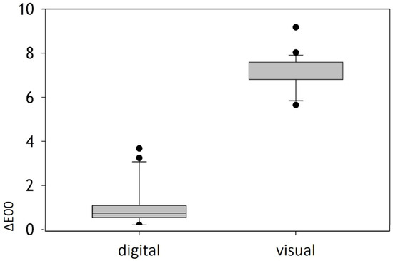 Comparison between visual and digital color determination. The ΔE00 values were significantly higher than ΔE00 values for digital color determination.