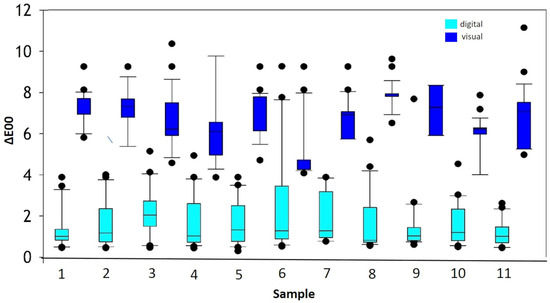 All samples showed ΔE00 values that were higher for visual color determination than for digital color determination.