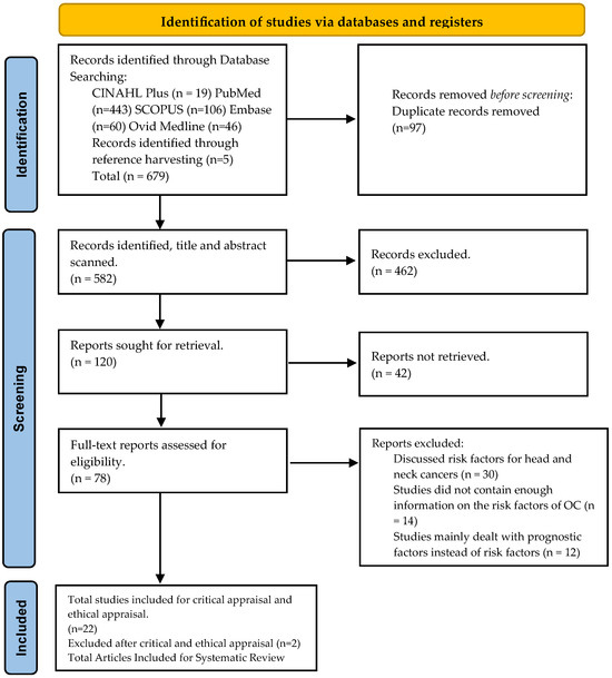 Relevant data were extracted from each research article and recorded using Microsoft Excel for Microsoft 365 MSO (Version 2312). For all the studies, the in-text citations of the research, design, and the context in which it was conducted, e.g., area, and size of the sample, were included. Key variables, including demographic characteristics, lifestyle factors, socioeconomic factors, genetic predisposition, and exposure to risk factors such as tobacco, alcohol, human papillomavirus, and other environmental agents, were systematically extracted and tabulated. This comprehensive data extraction process aimed to provide the evidence to demonstrate the multifaceted interplay between all the risk factors and incidences of OC.