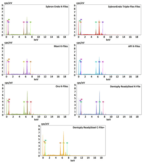 The macroscopic analysis of the instrument designs revealed distinct active area lengths on the blades, ranging from 16 mm (Dentsply ReadySteel K-File and C-File+) to 18 mm (SybronEndo Triple-Flex Files). Concurrently, the number of spirals exhibited variability, spanning from 24 (Dentsply ReadySteel C-File+) to 42 (SybronEndo K-Files). Notably, the Dentsply ReadySteel C-File+ displayed the lowest spirals/mm ratio (1.50 spirals/mm), while the SybronEndo K-Files exhibited the highest ratio (2.47 spirals/mm) (Table 1). All cross-sections were characterized by square geometries (Table 1). The scanning electron microscopic analysis identified symmetrical blades across all files. Moreover, the instruments demonstrated distinct tip geometries, with the API K-Files tip appearing thinner than any other. The SybronEndo K-Files and Triple-Flex Files displayed the most irregular instrument surface, while the Mani, API, and Oro K-Files exhibited smother surfaces (Figure 1). The EDS assessment confirmed that all instruments were made of stainless-steel metal wires, with equivalent atomic percentages of iron, chromium, and nickel among the groups (Figure 2 and Table 2).