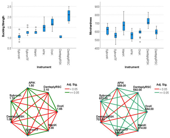 Mechanical performance for all tested instruments. The box and whisker plots (top) depict the buckling and microhardness results, while the pairwise comparisons (bottom) show the differences between groups (SybronK: SybronEndo K-Files; SybronTF: SybronEndo Triple-Flex Files; ManiK: Mani K-Files; APIK: API K-Files; OroK: Oro K-Files; DentsplyRSK: Dentsply ReadySteel K-File; and Dentsply RSC: Dentsply ReadySteel C-File+).