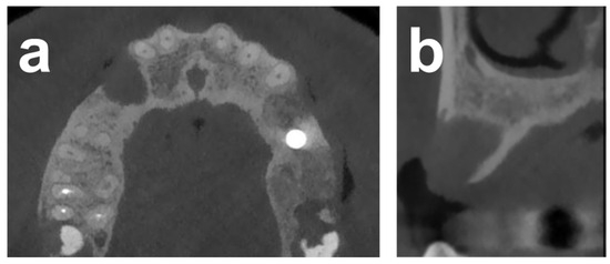 Figure 5 illustrates the baseline situation and treatment sequence, including defect exposure and allograft block augmentation secured with a temporary osteosynthesis screw. Allogeneous particles from block trimming were used to augment the lateral aspects around the block-augmented area, followed by membrane coverage and primary wound closure. The clinical situation after 5 months of healing and reopening for second-stage surgery, shown in Figure 5d,e, in conjunction with the follow-up CBCT at the corresponding follow-up time point, shown in Figure 6, indicated an adequate dimensional reconstruction of the alveolar dimensions. Implants (Bone Level, Ø4.1 × 10 mm) were placed in the ideal prosthetic position with adequate primary stability following removal of histological core biopsy samples.