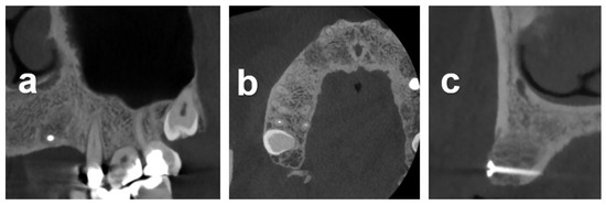 Sagittal (a), transversal (b), and frontal (c) 2D CBCT sections of the block-augmented area obtained 5 months after augmentation.