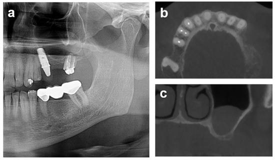 Case 3: Initial patient situation and baseline radiographic assessments of patient 2 three months after tooth and implant removal. (a) Pre-treatment panoramic radiographic assessment of the patient after removal of his left posterior restoration. Implant 24 was diagnosed with progressed peri-implantitis. Root remnants of abutment tooth 26 presented fractured, with a peri-apical pathology, and were indicated for extraction. (b) Two-dimensional transversal maxillary CBCT section illustrating the progressed horizontal atrophy in the distal aspect 3 months after implant and tooth removal. (c) Two-dimensional frontal plane in zone 26 illustrating the pronounced vertical alveolar atrophy of the distal maxilla after tooth removal omitting implant placement without prior augmentation. Membrane thickenings of the sinus floor, potentially associated with inflammatory processes at implant 24 and tooth 26, were confirmed to be non-pathological by a specialist and resolved spontaneously after extraction and explantation, respectively.