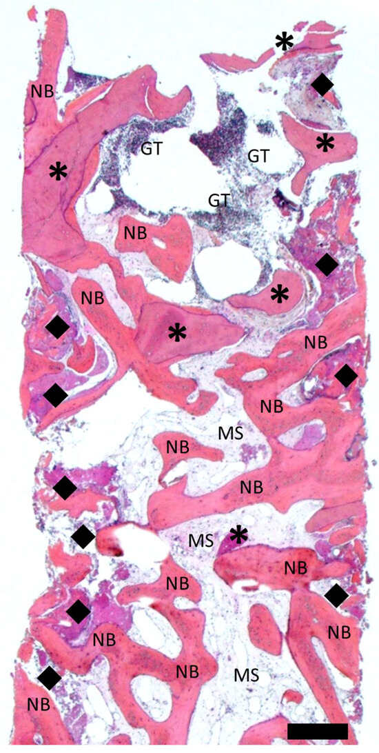 Overview of a representative core biopsy histological mesiodistal cross-section from Case 1. Bone graft remnants were stained with increased intensity (asterisks). Newly formed trabecular bone appeared slightly less intensely stained (N.B.) and separated by marrow spaces (M.S.). The remaining bone graft at the lateral aspects of the core biopsy was characterized by ongoing resorption and new bone formation (black diamonds) compared to the more intact remaining bone graft in the center of the biopsy. Zones of granulation tissue (G.T.) were apparent at the central coronal aspect of the biopsy. Scale bar: 500 µm.
