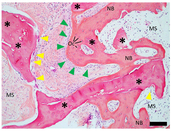 Representative high magnification histological cross-section of core biopsies (“carrot”) obtained from patient 2 illustrating the processes at the lateral aspects of the biopsies displaying bone ingrowth. The remaining bone graft was identified as comprising darker stained areas (asterisks), and newly formed trabecular lamellar bone as brighter pink structures (N.B.) intercalated with numerous marrow spaces (M.S.). Newly formed bone was characterized by osteocytes (Oc) while the remaining graft displayed empty osteocyte lacunae. Osteoclasts were found at the surface of the remaining bone graft (yellow arrows), while osteoblast seams indicated active bone formation at the newly formed trabecular bone surface (green arrows). Marrow spaces occasionally showed the presence of fibrous tissue. Scale bar: 200 µm.