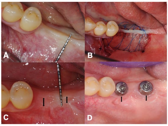 - Schmitt, C.M.; Moest, T.; Lutz, R.; Wehrhan, F.; Neukam, F.W.; Schlegel, K.A. Long-Term Outcomes after Vestibuloplasty with a Porcine Collagen Matrix (Mucograft ®) versus the Free Gingival Graft: A Comparative Prospective Clinical Trial. Clin. Oral Implants Res. 2016, 27, e125–e133. [Google Scholar] [CrossRef]
