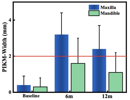 Intragroup measurements of the change in the PIKM-W were performed separately in both the maxilla and the mandible (Table 2 and Table 3). The mean PIKM-W changed from 0.42 ± 0.47 mm to 3.17 ± 1.21 mm (2.75 ± 0.53 mm difference, p < 0.001) at the 6-month follow-up and to 2.36 ± 1.34 mm (1.94 ± 0.62 mm difference, p < 0.001) at the 12-month follow-up in the 12 maxillary sites (Figure 2).