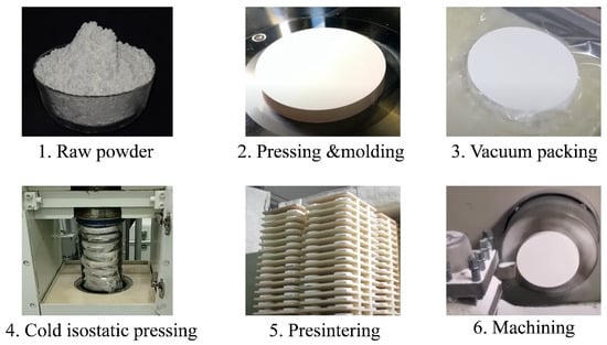 The production of zirconium dioxide CAD/CAM blocks is based on the dry-pressing process, a simple method that has the advantage of offering easy batch production, in addition to the fact that the ceramic blocks obtained have few defects and are of good quality, which is convenient for mechanized and automatic production. This production process is generally composed of the following steps: raw material process, green-forming process, pre-sintering, block-forming process, and inspection and packaging. These steps are briefly detailed below [89].