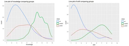 Analyzing “knowledge” and “skill” (Figure 2), it was noted there was a significant difference between pre-D2 and all the controls (p < 0.001 for both). This means that pre-D2 is not comparable with the other controls except for knowledge and skill. Thus, it did not seem appropriate to compare post-D2 with the other controls for the knowledge and skill questions since the difference could not be linked to the intervention.