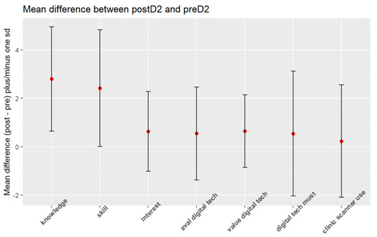 The evaluated interest question had a statistically significant result (p < 0.05), demonstrating that the pre-D2 students were comparable with all the controls in terms of their interest in digital dentistry. Also, there was a significant difference between post-D2, control D1, control D3, and control D4 for the subject “interest” (p = 0.02). For the outcome “interest”, there was a significant difference between post-D2/control D1 (p = 0.0362). Multiple comparisons were made to compare the measures between pre-D2 and post-D2 (same students). It was observed there was a significant difference between pre-D2 and post-D2 in terms of “interest” (p = 0.0102) (Figure 3 and Supplementary Figure S1). In addition, multiple comparisons were made for post-D2 and all the control groups (control D1, control D3, and control D4). There was a significant difference between post-D2 and all the controls in terms of “interest” (p = 0.0127).