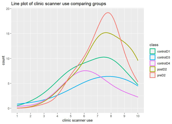 Multiple comparisons were also used to compare post-D2 with control D3 and control D4 combined. A significant difference between post-D2 with control D3 and control D4 combined was found for “importance given to technology availability in an office” (p = 0.0043) and “the relative frequency of clinics having the technology” (p = 0.0203). No significant difference was noted between control D1, control D3, and control D4 combined for all the questions (Figure 4).