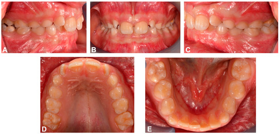 Pre-treatment intraoral photographs. (A) Right lateral intraoral view; (B) frontal intraoral view; (C) left lateral intraoral view; (D) upper occlusal intraoral view; (E) lower occlusal intraoral view.