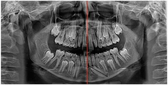 Pre-treatment panoramic radiograph. The angle subtended by the line passing through the mandibular midline (red) and the line passing through the long axis of the mandibular canine (black) were traced.