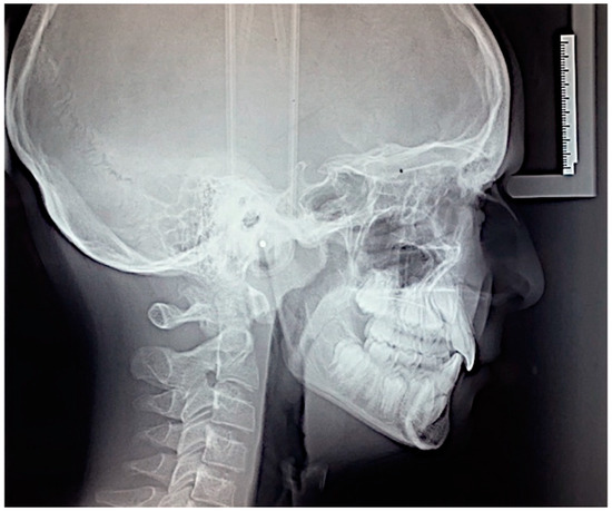 The cephalometric analysis performed using Oris Ceph software Rx CE (Oris Ceph, Elit Computer, Vimodrone, Milan, Italy) showed a skeletal Class I relationship (skeletal class reference angle formed by maxillary point A, nasion and mandibular point B; ANB = 2°) with a hypodivergent vertical grow pattern (angle of divergence from the Frankfurt plane and the mandibular plane, FMA = 21°). The maxillary incisors were palatally inclined (angle of the maxillary incisor inclination with the palatal plane, U1-PP = 102°) and the angle of the mandibular incisors was in in the normal range (angle of inclination of mandibular incisor with mandibular plane, IMPA = 89°) (Figure 4).