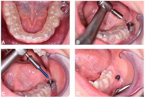 Intraoral occlusal view of surgical guide insertion (A); pre-drilling to guide miniscrew insertion (B); miniscrew insertion (C); miniscrew in place (D).
