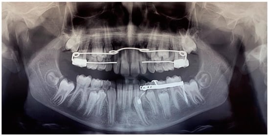 - Ciavarella, D.; Maci, M.; Fanelli, C.; Lorusso, M.; Laurenziello, M.; Lo Muzio, L.; Caroprese, M.; Cazzolla, A.P.; Tepedino, M. Treatment of Mandibular Impacted Canine in a Patient with Class II Division 1 Malocclusion with “Reverse Pin”: A Case Report. Medicina 2023, 59, 1774. [Google Scholar] [CrossRef]