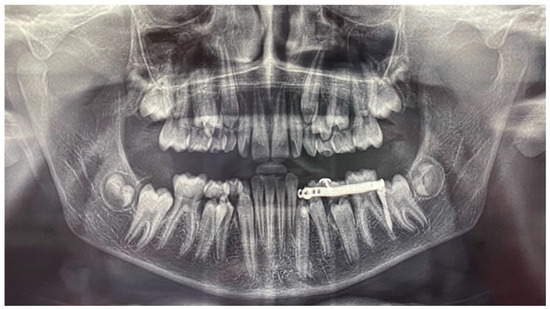 Panoramic radiograph at the end of the orthodontic traction with the customized skeletal anchorage device.
