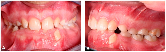 Frontal (A) and lateral (B) intraoral view after removal of the customized disimpaction device and miniscrew.