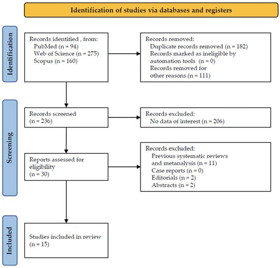 The starting search supplied a total of 529 studies: 94 from PubMed, 275 from Web of Science, and 160 from Scopus. No studies were deleted due to being ineligible by automation tools, while 182 studies were removed because of duplication. Overall, 111 studies were removed for other reasons, for example, for their employment in other districts (gut, immune system, cardiovascular system). A total of 236 studies accessed the screening phase, and a total of 206 studies were withdrawn because they failed to demonstrate any data of interest, for example, because they were conducted in vitro or in animals. Eligibility was assigned to 30 studies based on their abstracts, from which 11 were erased for being systematic reviews, 2 for being abstracts, and 2 for being editorials. Finally, a total of 15 studies were incorporated for the inclusion phase (Figure 1) and analyzed according to their full text.