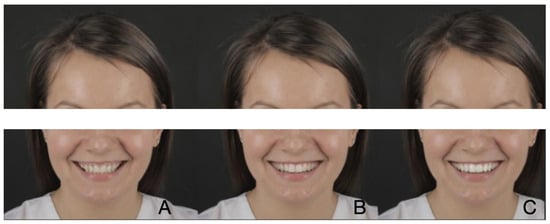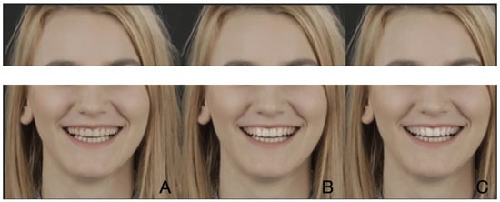 - Parrini, S.; Rossini, G.; Castroflorio, T.; Fortini, A.; Deregibus, A.; Debernardi, C. Laypeople’s perceptions of frontal smile esthetics: A systematic review. Am. J. Orthod. Dentofacial. Orthop. 2016, 150, 740–750. [Google Scholar] [CrossRef] [PubMed]