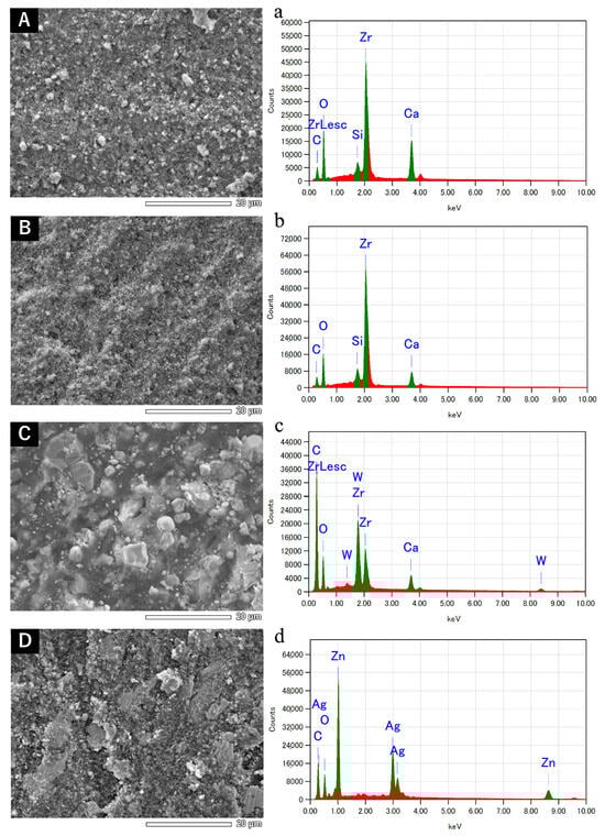 The sealers were filled into polytetrafluoroethylene molds (2 mm inner diameter, 5 mm height) and placed either in a 37 °C incubator or in an oven at 100 °C for 30 or 60 s, followed by being transferred to the incubator at 37 °C. Following storage for 48 h, the specimen’s surface was polished using SiC papers to #1200 and osmium-coated. The surface ultrastructure was examined using scanning electron microscopy (SEM; model JSM-7900F, JEOL, Tokyo, Japan), and elemental compositions were analyzed using energy-dispersive X-ray spectroscopy (EDS; model JED-2300, JEOL).
