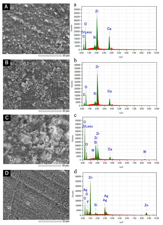 Backscatter scanning electron micrographs (A–D) and energy-dispersive X-ray microanalysis (a–d) of sealers subjected to heat application at 100 °C for 1 min and then left to set at 37 °C: (A,a) AH Plus Bioceramic Sealer, (B,b) EndoSequence BC Sealer, (C,c) AH Plus Jet, and (D,d) Pulp Canal Sealer.