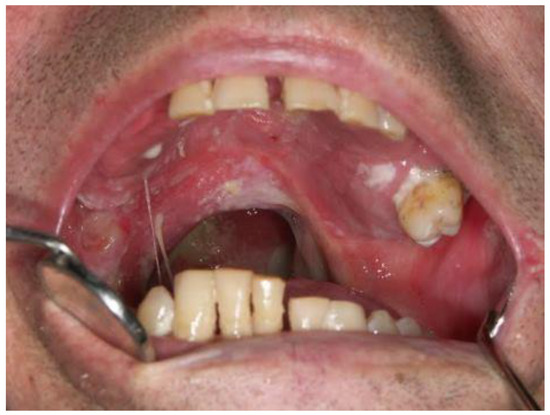 Mucositis and xerostomia in a patient undergoing radiotherapy after surgery of oropharyngeal cancer. Ulcerated and inflamed areas of the oral mucosa can be seen along with thick mucous saliva and white plaque deposits on the mucosa due to lack of serous saliva and washing of mucosa (Courtesy of Prof. Dr. Marinka Mravak-Stipetić).