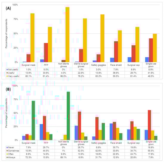 Participants were asked to grade, in their opinion, the usefulness of each type of PPE for their practice. Non-sterile gloves ranked highest, followed by safety goggles, surgical masks, and sterile surgical gloves, all being considered “very useful” by more than three quarters of the respondents (Figure 1A).