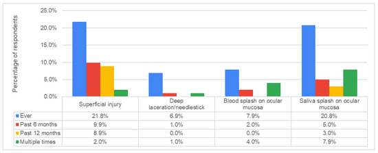 A total of 41 (40.6%) students reported to have had at least one prior episode of accidental occupational exposure, with the following frequencies of different types of exposures: superficial injury 21.8%, deep laceration or needlestick injury 6.9%, blood splash on ocular mucosa 7.9%, and saliva splash on ocular mucosa 20.8% (Figure 2).