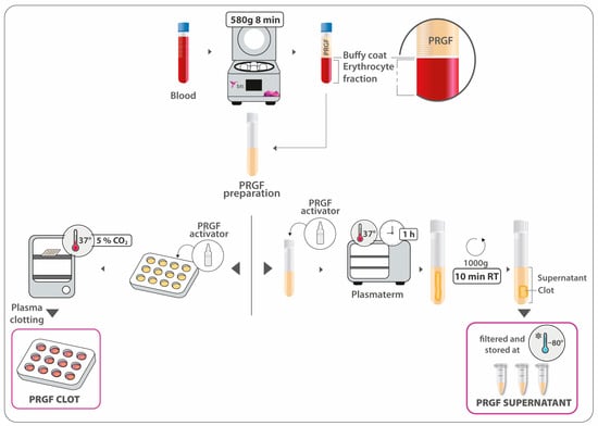 A schematic representation of the process of obtaining the two PRGF formulations: the PRGF clot and the PRGF supernatant.