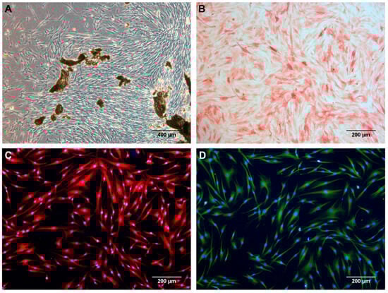 Alkaline phosphatase activity was detected in all the cells isolated from the bone particles (Figure 2B). Furthermore, the immunofluorescence detection of osteocalcin and osteopontin resulted in an entirely positive labelling of alveolar bone-derived cells regarding both biochemical osteoblastic markers (Figure 2C,D). Considering that no Hoechst-stained nuclei were detected without being associated with the labelling of any of the two proteins, it could be affirmed that almost all cells were positive for osteocalcin and osteopontin bone markers. Hence, the results from both characterisation assays confirmed the osteoblastic nature of the isolated cells.