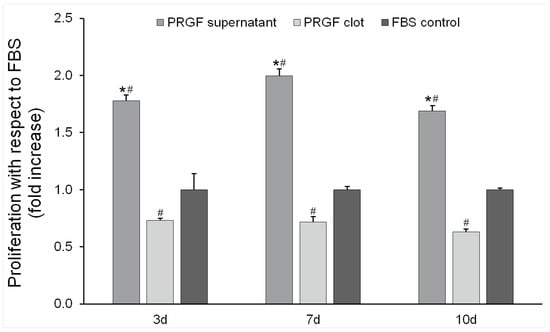 Cell proliferation assay. Osteoblast cells were treated with PRGF clot and PRGF supernatant formulations for 3, 7, and 10 days (n = 4). Results were expressed as fold increases with respect to the proliferation achieved in the control condition (osteoblasts cultured on bare plastic surface with ObM supplemented with 15% FBS (v/v)). * Statistically significant differences with respect to control condition for the same study period (p ≤ 0.05). # Statistically significant differences with respect to PRGF clot for the same study period (p ≤ 0.05).