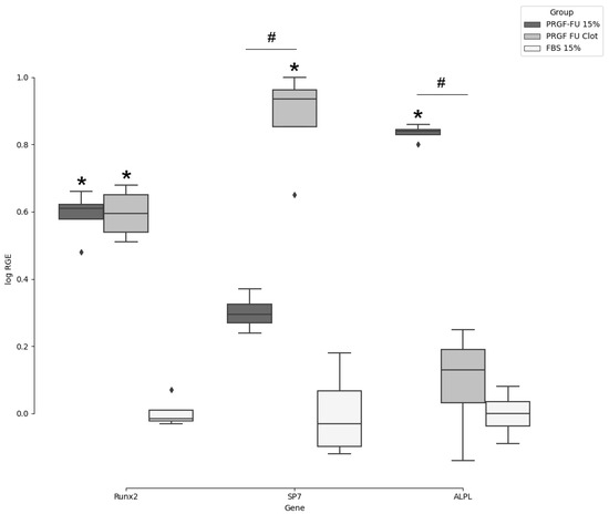Box plot for gene expression levels (log RGE) of Runx2, SP7, and ALPL in human osteoblasts in response to different culture conditions (n = 4). Statistical significance (p ≤ 0.05) is represented as relative to control (*) and between treatments (#).