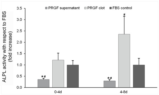 ALPL activity determination in the culture medium conditioned by bone cells. ALPL enzymatic activity in the extracellular milieu of bone cells treated with PRGF formulations (n = 4). Results expressed as fold increases with respect to the data obtained for the control condition (osteoblasts cultured on bare plastic surface with ObM supplemented with 15% FBS (v/v)). * Statistically significant differences with respect to the PRGF clot (p ≤ 0.05). # Statistically significant differences with respect to the control condition for the same study period (p ≤ 0.05).