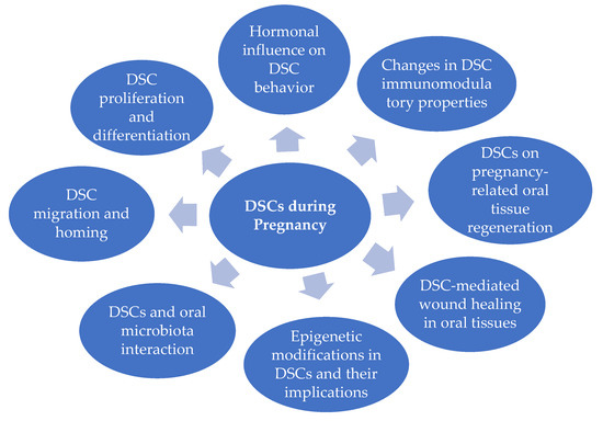 Extensive research should focus on the therapeutic potential of DSCs in pregnancy-associated oral diseases, particularly elucidating the biomolecular mechanisms responsible for the beneficial effects. Furthermore, efforts should be directed toward optimizing the delivery methods and dosing regimens of DSC-based therapies to maximize their therapeutic efficacy. Scheme 1 outlines key issues that may deserve special attention and should ideally become priority topics for assessment by both basic and clinical researchers. The ability of DSCs to proliferate and differentiate during pregnancy (even at different stages of fetal development), their capacity to migrate and regulate immune responses in response to hormonal changes, and the potential alterations in their interaction with the oral cavity microbiota influenced by pregnancy are all crucial aspects that need clarification. A deep understanding of these issues will promote the clinical use of DSCs during pregnancy, especially regarding their role in maternal oral healing, tissue regeneration, and fetal wellness.